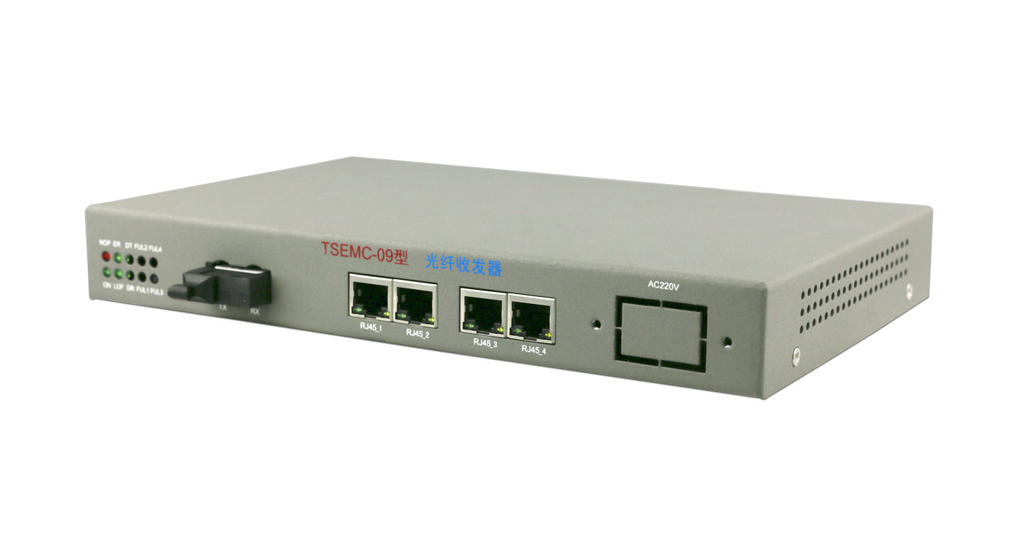 TSEMC-09 型 4物理隔离以太网光纤收发器是广州天烁通讯科技有限公司根据客户目前的应用要求进行开发生产的一种通过光纤进行传输,将多个以太网接口信号进行延长的光纤接入单元设备。
